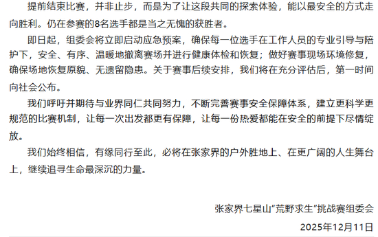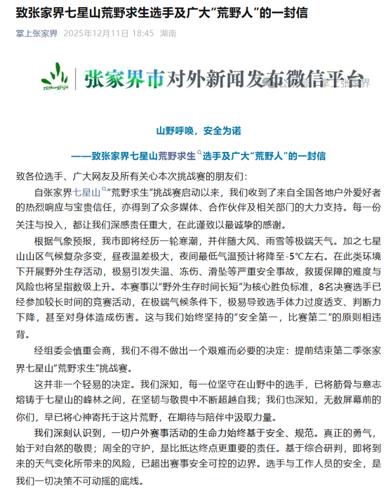 12月11日晚上,张家界七星山“荒野求生”挑战赛组委会突然发布《致张家界七星山荒野求生选手及广大“荒野人”的一封信》。