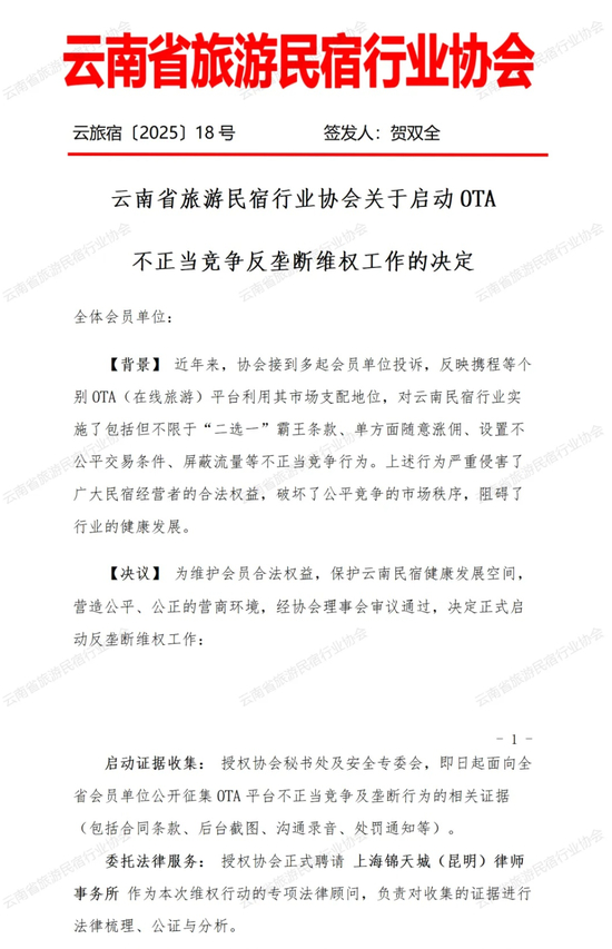 上述《决定》中还提到,即日起面向云南省会员单位公开征集0TA平台不正当竞争及垄断行为的相关证据(包括合同条款、后台截图、沟通录音、处罚通知等),并委托律师事务所负责对收集的证据进行法律梳理、公证与分析;在证据确凿的基础上,协会将代表全体受害会员,向相关部门提起集体投诉,并保留提起反垄断诉讼的权利。